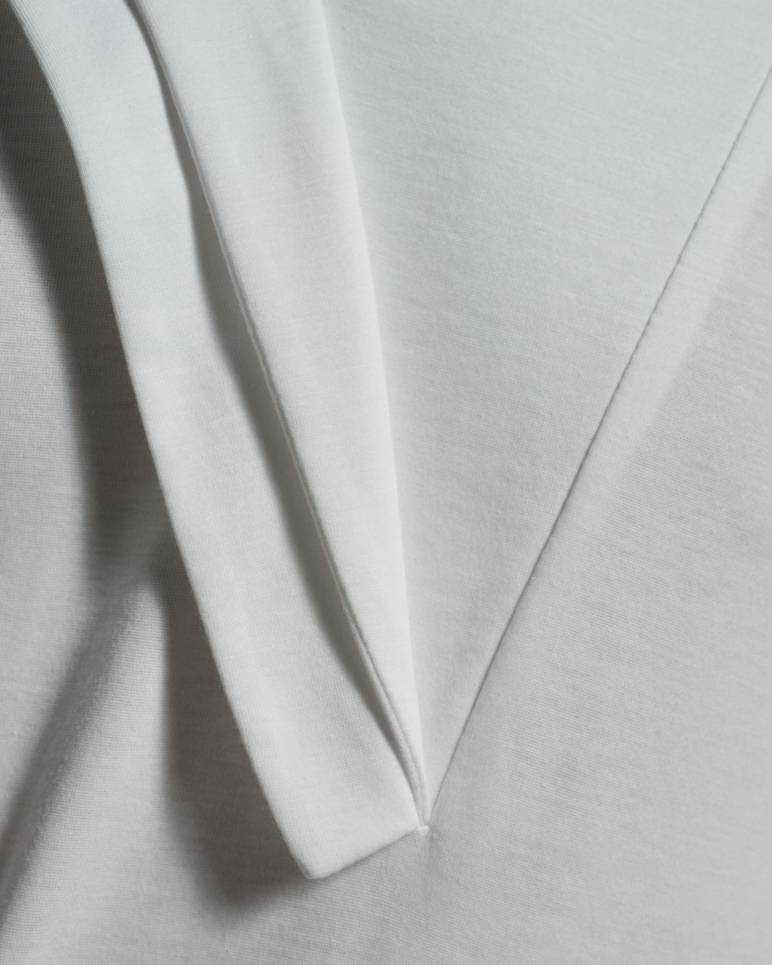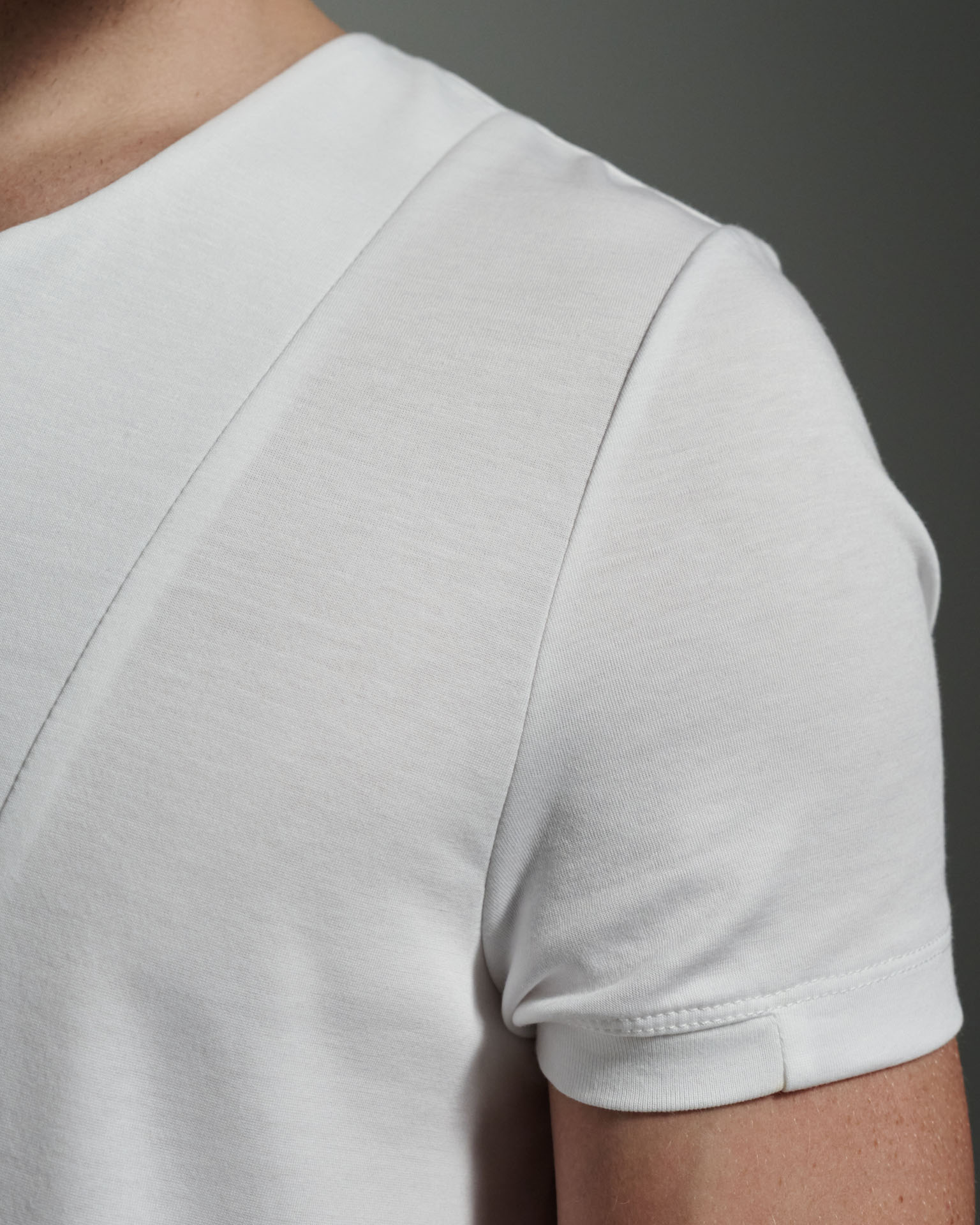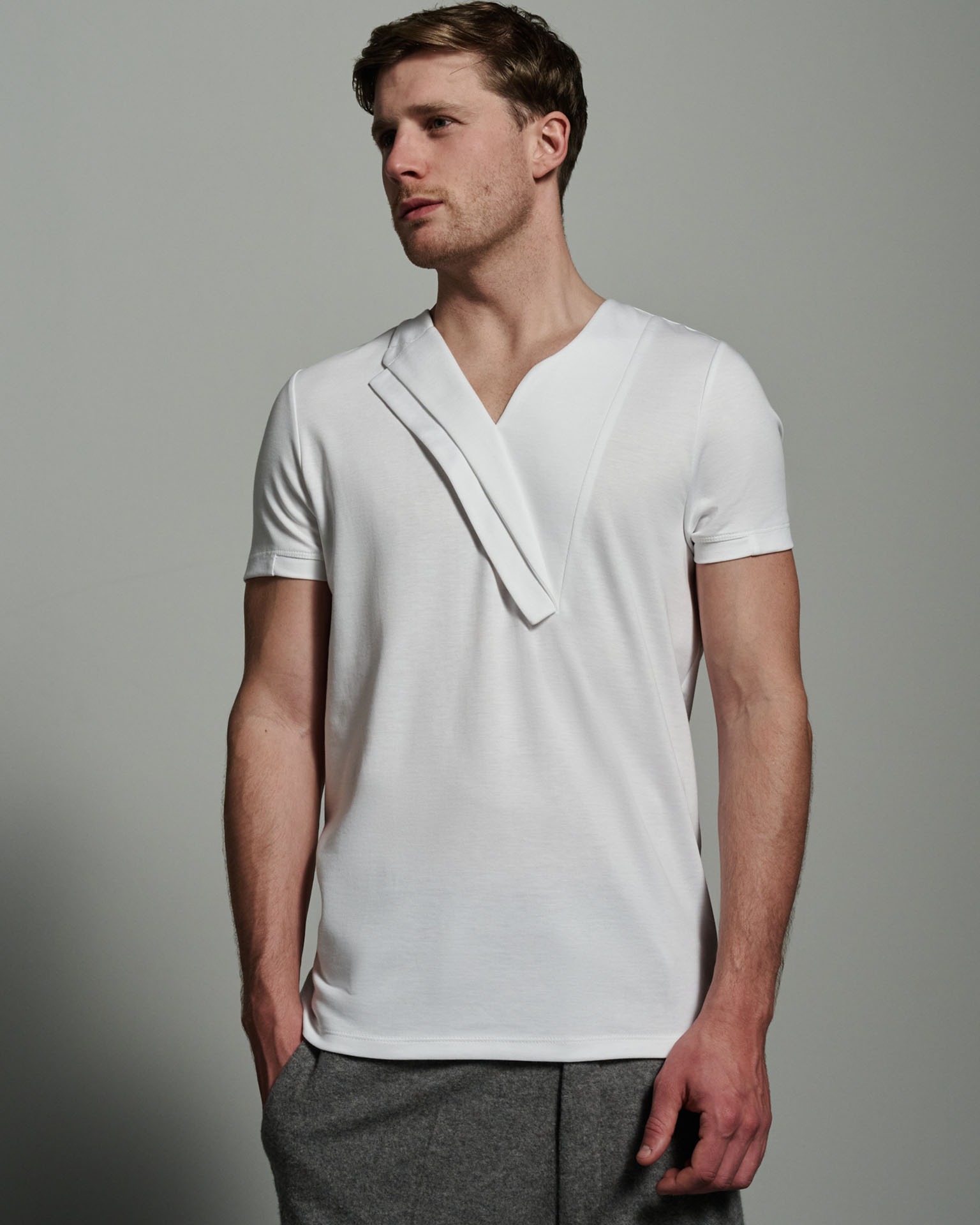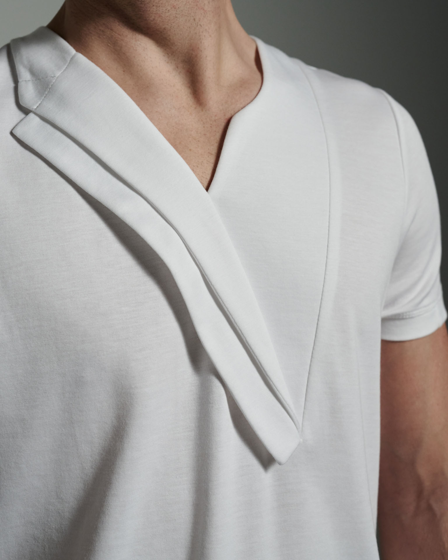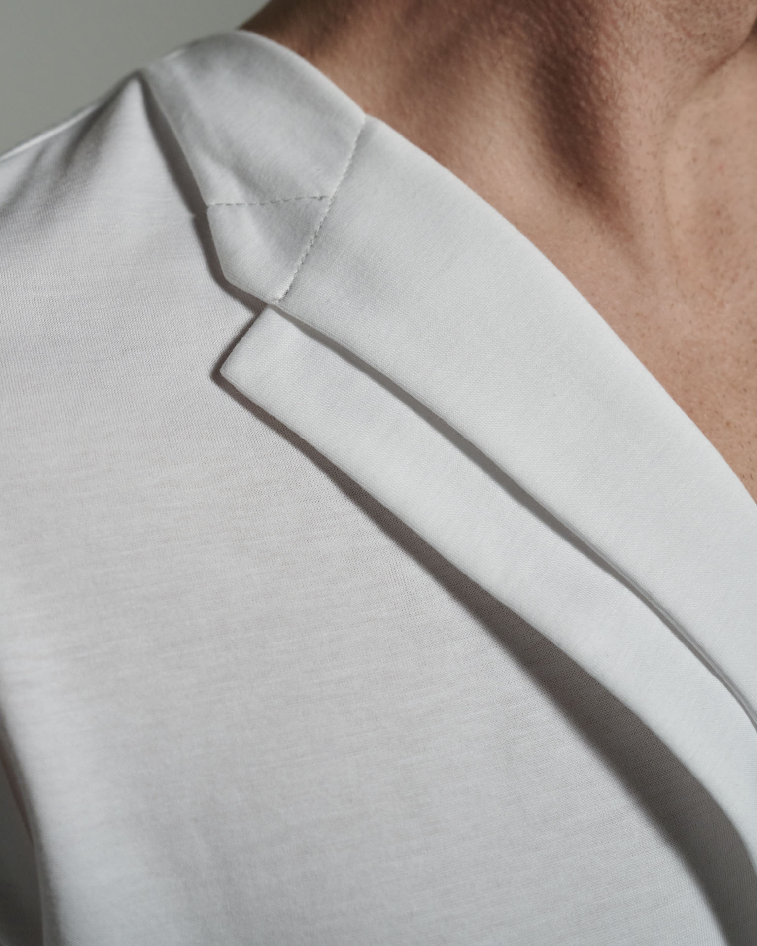 Bib fronted with double lapels, and a half notch neck with W. Rubens signature notch detail with grey embroidery. W. Rubens signature back notch lapel, slim block with side seams. Made in England from the finest mid-weight cotton. Back detail with contrast grey stitching, angled vents, short sleeves finished with rib on cuff.