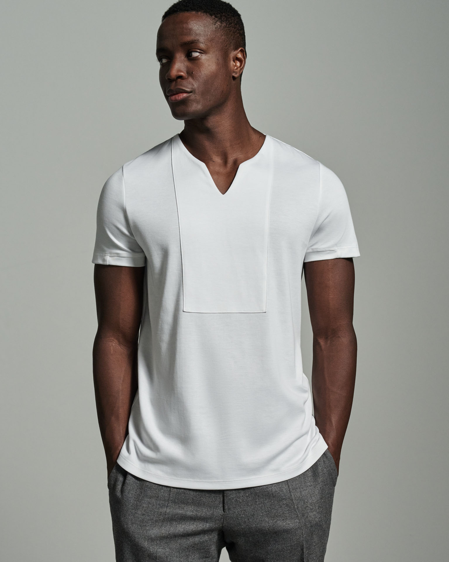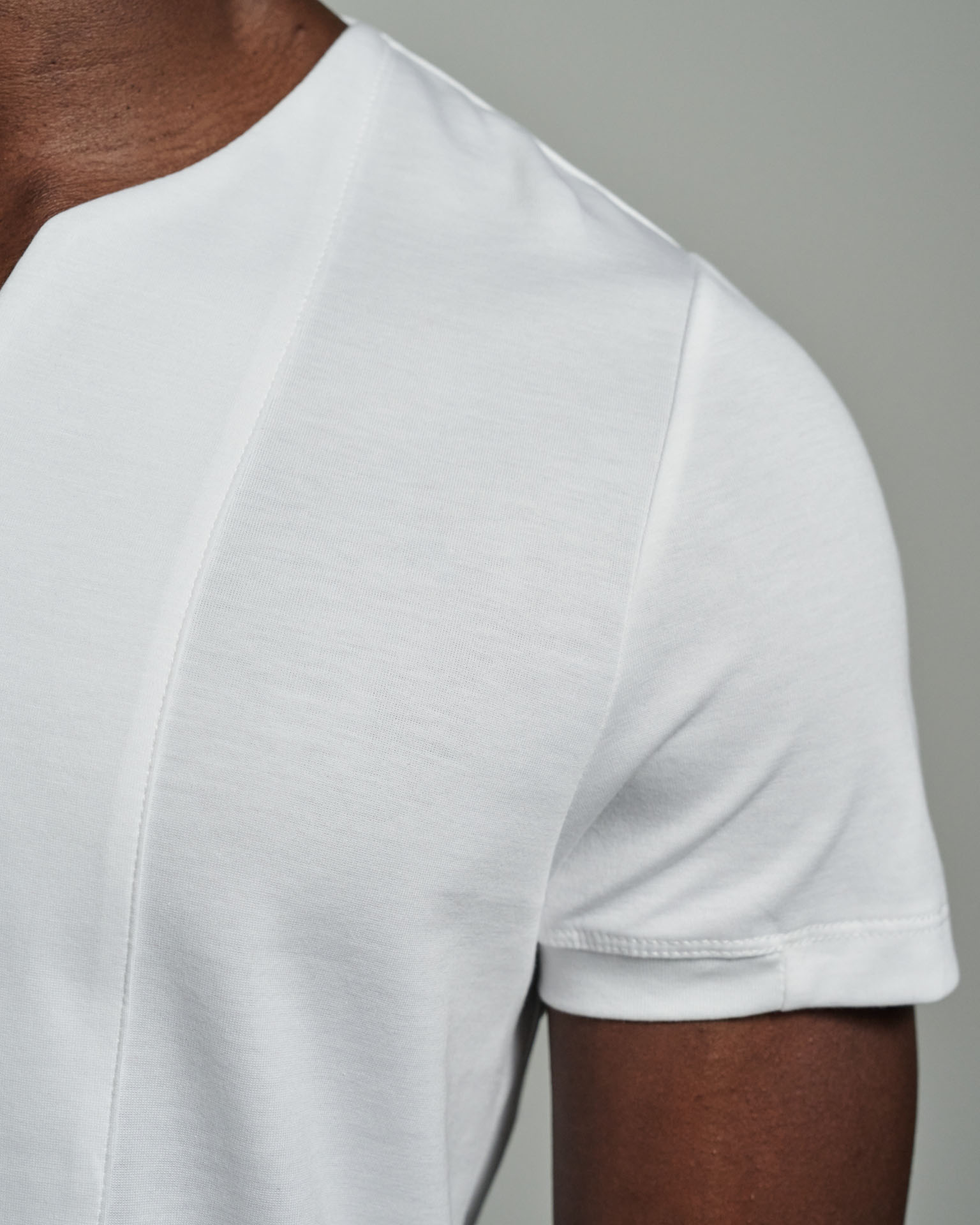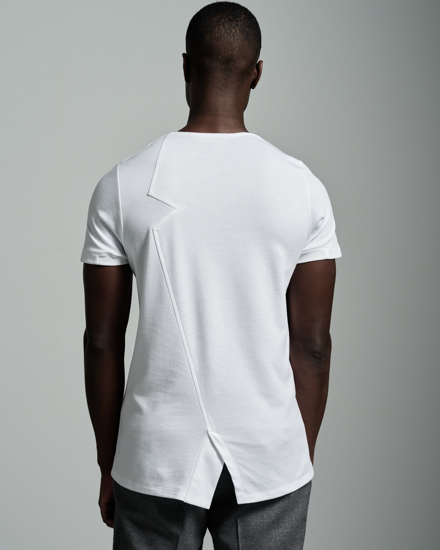 Bib fronted with notched neckline, seamless bib with a sharp edge stitch detail. W. Rubens signature back notch lapel, slim block with side seams. Made in England from the finest mid-weight cotton. Back detail with contrast grey stitching, angled vents, short sleeves finished with rib on cuff.